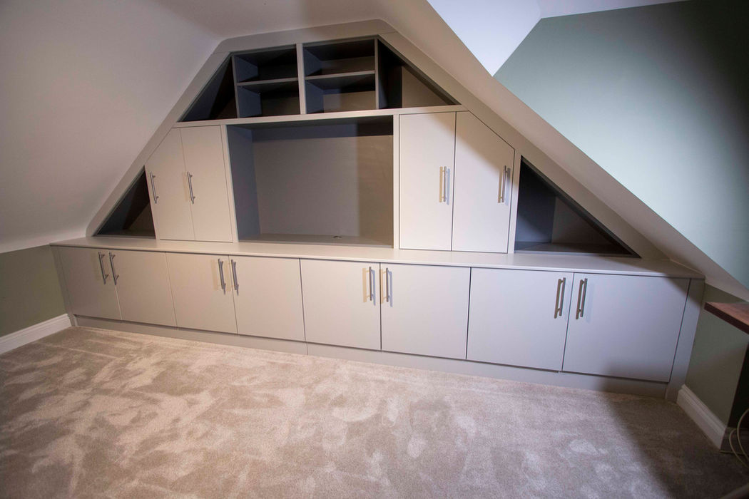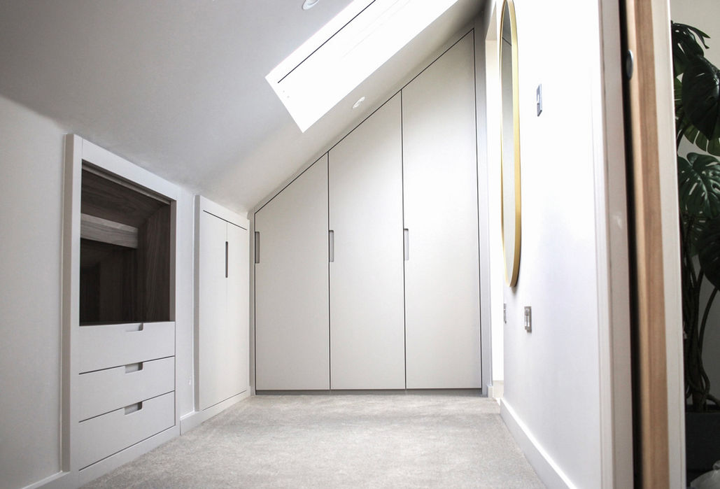 Dormer room, handle-less walk in wardrobes